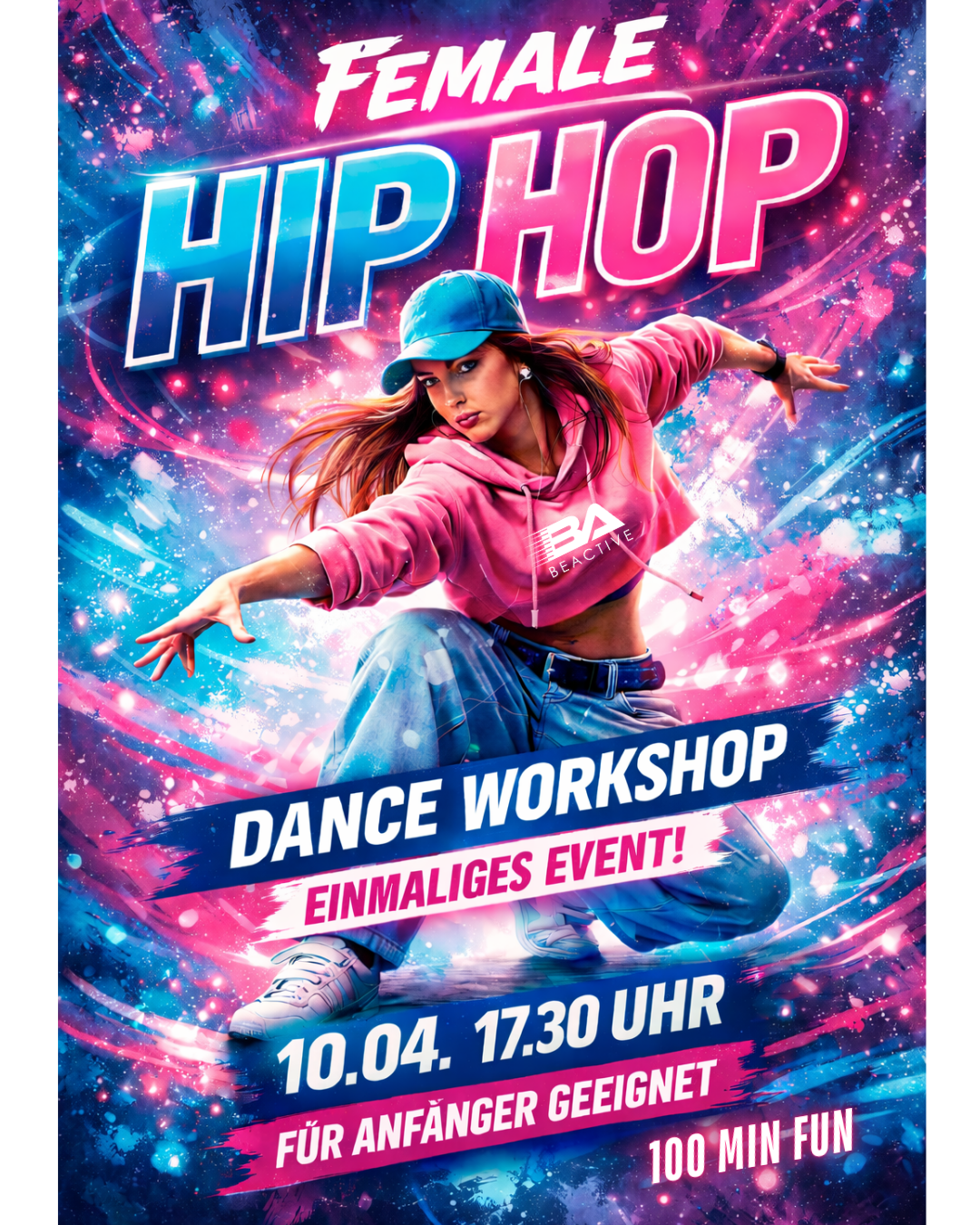Komm am 10.04. zum einmaligen Event und lerne in 100 Min eine Choreographie im Hip Hop female Style. Was das bedeutet? Du lernst die Basic Hip-Hop Schritte und wir setzen sie „weiblich – female“ um, sodass jede/r seine individuelle Interpretation reinlegen kann. Es geht nicht um Perfektion, es geht um Spaß am Tanzen, an der Umsetzung von Schrittkombos und um das Gruppengefühl. Lasst uns zusammen einen Abend voller Rhythmus, Spaß und Bewegung verbringen. Im Anschluss stoßen wir noch auf unsere tolle Choreographie an bei einem Sektchen 🙂
